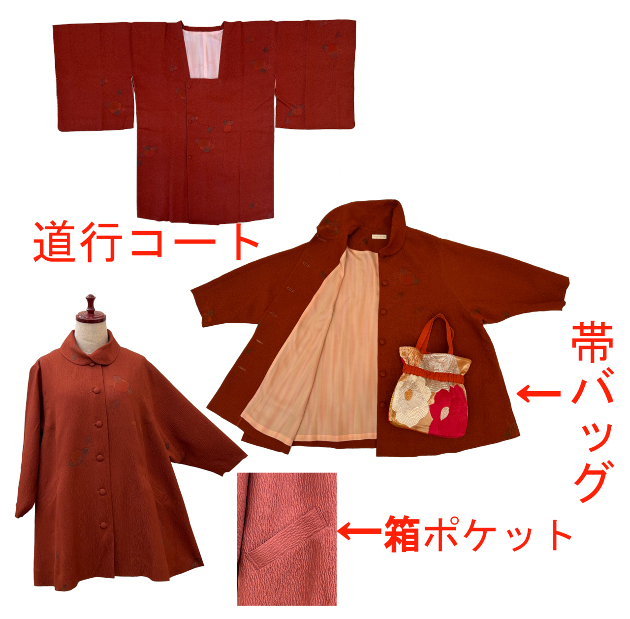 黒留袖,色留袖,訪問着,付け下げ,色無地,小紋,羽織,雨コート,紬,絣,しじら織り,浴衣等,様々なお着物をリメイクしています。お客様のお声を大事に、ご希望のワンピース,ワンピースドレス,ジャンパースカート,ボレロ,ジャケット,コート,ブラウス,アロハシャツ,ショール,バッグ等にリメイクしています。リーズナブルな規格サイズのリメイクもご用意していますので、お試しください。