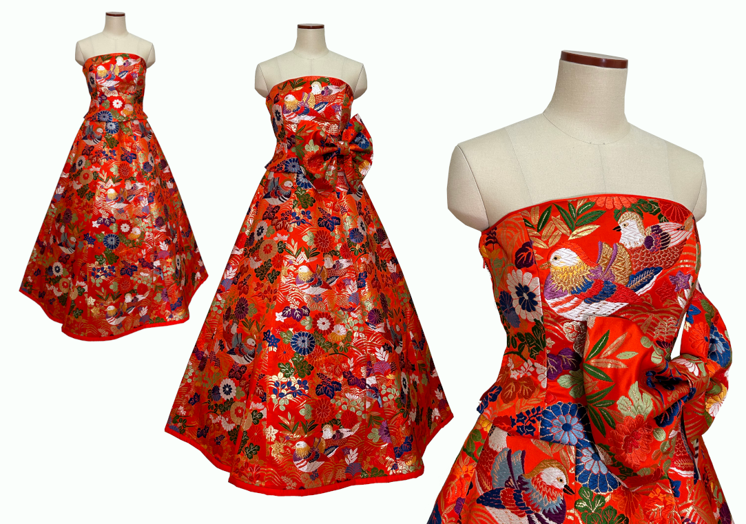 着物リメイクのエレガントなフレアードレスです。振袖からのリメイク以外にもリメイク可能です。お手持ちのお着物でリメイク可能かどうか、お気軽にお問い合わせください。