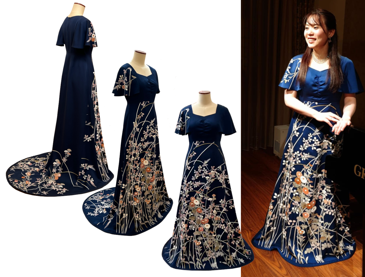 家紋を入れて頂きたいと伝えただけですが、3週間で完成したドレスには両袖と背中にも家紋が付けてあり、また、絵羽模様も途切れることなく素晴らしい技術に感動しました。