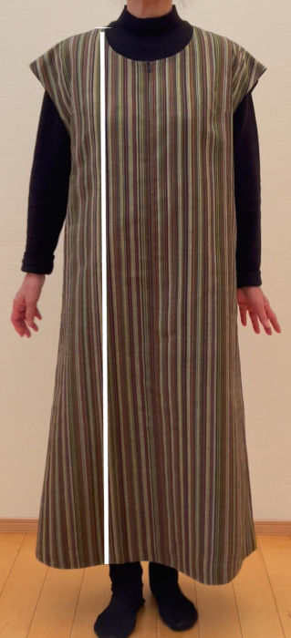 Tシャツの上に重ねた場合の目安です。厚地のものやゆったりした着方の場合は、ワンサイズ大きめをお選びください。着丈は、短くできます。ご希望の着丈を事前にお知らせ下さい。脇縫い目利用のポケット有ります。