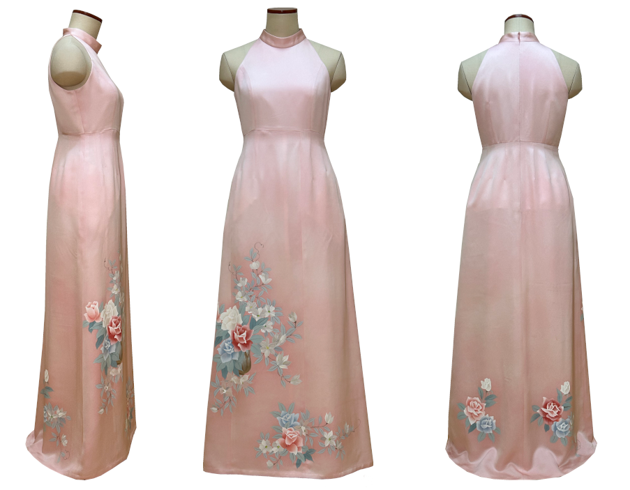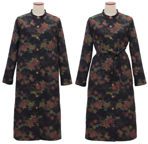 V明きに立ち衿にしています上半身に模様の配置も可能な着物ワンピースドレスです。留袖,訪問着,付け下げ,小紋等、模様のお着物がリメイクに最適です。