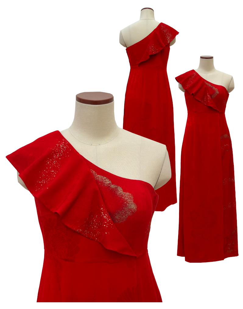 肩を包み込む袖のデザインです。袖のくりは、仮縫いで合わせていきます。ボレロ等の、上着も合わせてリメイク可能です。エレガントなシルエットの着物ドレス