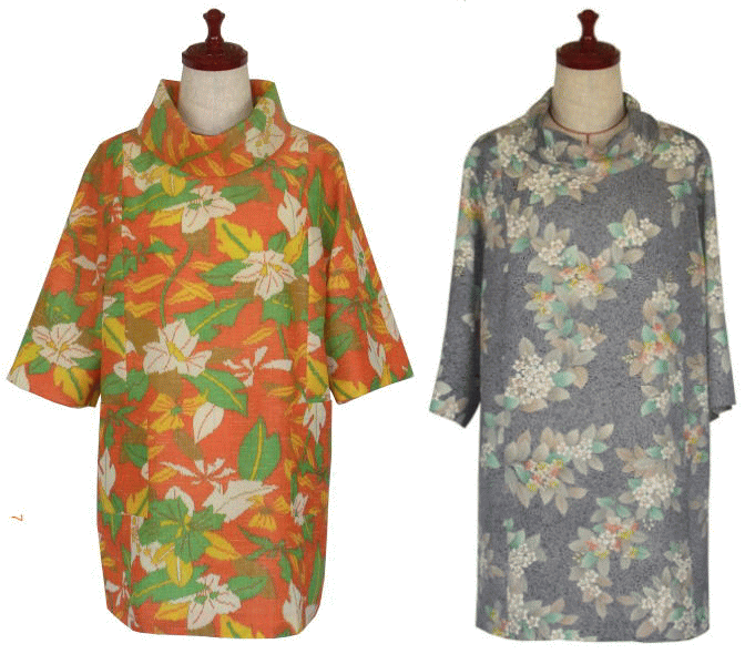 全体は、セミタイトシルエットです。肩を大きく明けたアメリカンスリーブの着物リメイクワンピースです。襟元はハイネックと丸衿明の2種類からお選びください。胸元のタック有、無しは事前にお伝えください。人気のデザインです