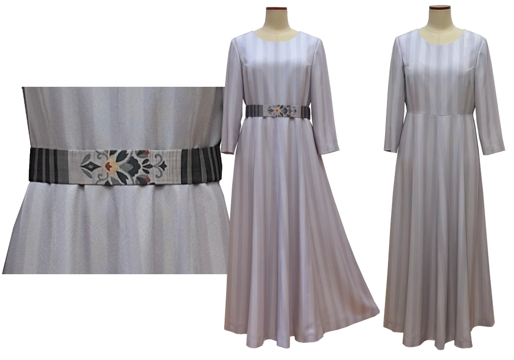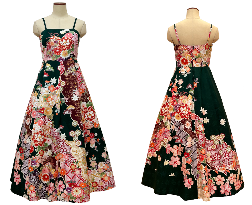 一本の帯から仕立てられるショート丈のフレアードレスです。帯ならではの豪華さと可愛らいドレスになります。