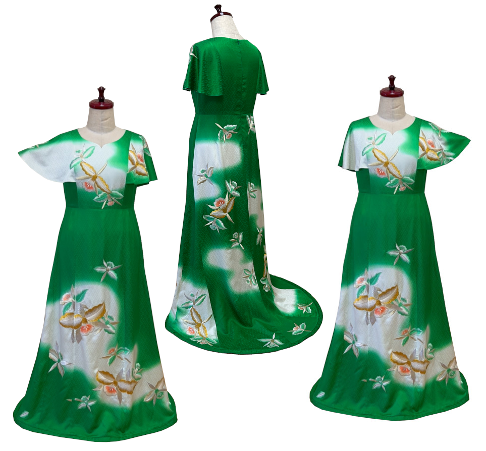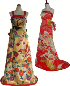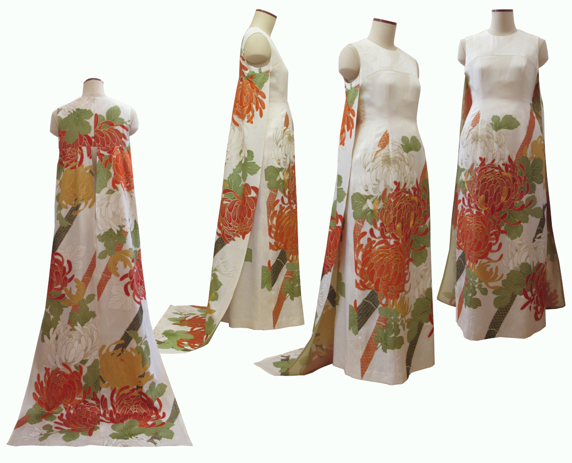 振り袖をAラインのトレーンドレスにリメイク可能です。お客様の体系に合わせて別布で仮縫いをします。眠っている振り袖があるならば、結婚式やステージ衣装として活用してほしいと思います。訪問着、付け下げ、小紋でも工夫次第でリメイク可能です。ご相談ください。