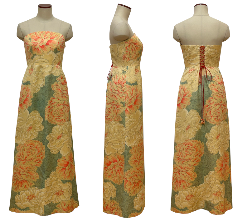 お客様お手持ちの振袖、留袖、訪問着、付け下げ、小紋、色無地等のお着物をベアトップドレスにリメイクします。