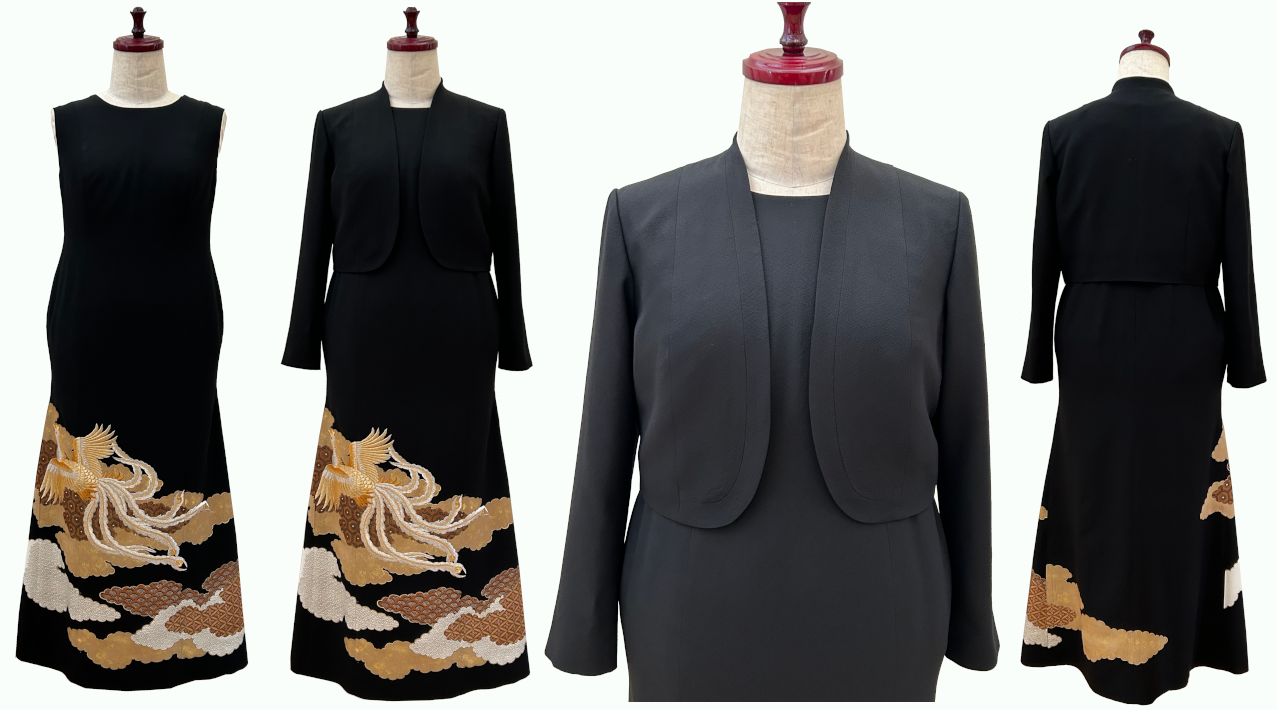別布で仮縫いをしてお仕立てしますので、綺麗なシルエットの着物ドレスに完成します。全てのお着物、反物からお仕立てが可能です。