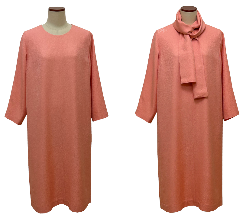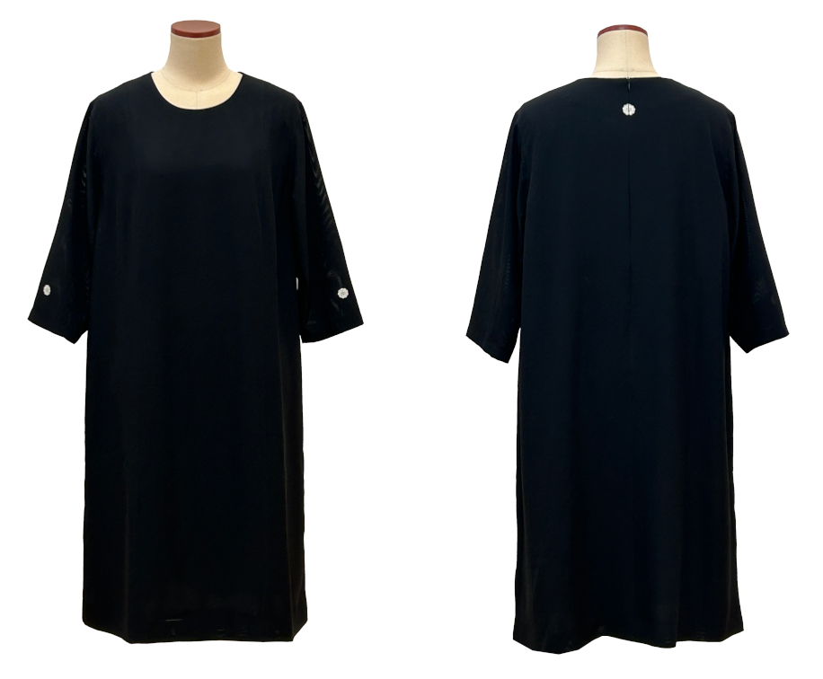 デザインの特徴は、ノーカラーでバストから裾までのラインは直線です。