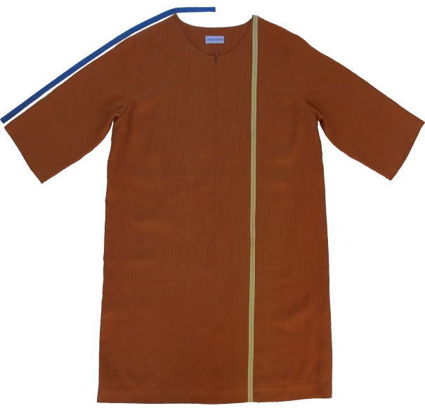 デザインの特徴は、ノーカラーでバストから裾までのラインは直線です。